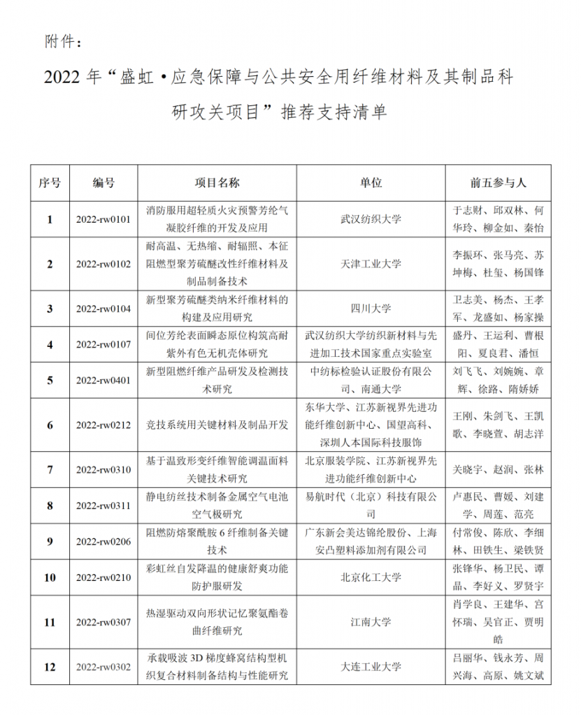 From《2022The "Shenghong · Scientific Research Project of Fiber Materials and Their Products for Emergency Security and Public Safety" was issued in2022year5month31National Advanced Functional Fiber Innovation Center (hereinafter referred to as the "Innovation Center") jointly solicited projects33Item.According to the Measures for Project Review, all the solicited projects are finally supported after preliminary formal review, preliminary evaluation and re evaluation by the expert committee, and approval by the presidium of the Foundation12Projects, focusing on the development of a new generation of high-tech fiber materials with high performance, multi-function and high protection level and the improvement of technical level, encouraging the innovation of the industrial chain of basic research, key technologies, application and promotion of high-tech fiber materials and products for protection and public safety, and promoting the innovative design of the end product structure, the transformation of achievements of high-tech fiber materials and their performance testing, functional evaluation Establishment and improvement of the standard system.According to the relevant management regulations of the Innovation Center, in order to further implement the principle of "openness, fairness and justice", increase the transparency of project management, and accept the supervision of all sectors of society2022The proposed project of "Shenghong · Research and Tackling Key Problems of Fiber Materials and Their Products for Emergency Security and Public Safety" was publicized in the year. Publicity time:2022year7month20Solstice7month27See the appendix for details of the publicity contents.During the publicity period, if there is any objection, please report it to the Innovation Center in writing and provide necessary evidence for verification. The objector must provide his/her real name, work unit, contact number and other effective contact information (strictly confidential). Any anonymous, pseudonymous or overdue objection will not be accepted.